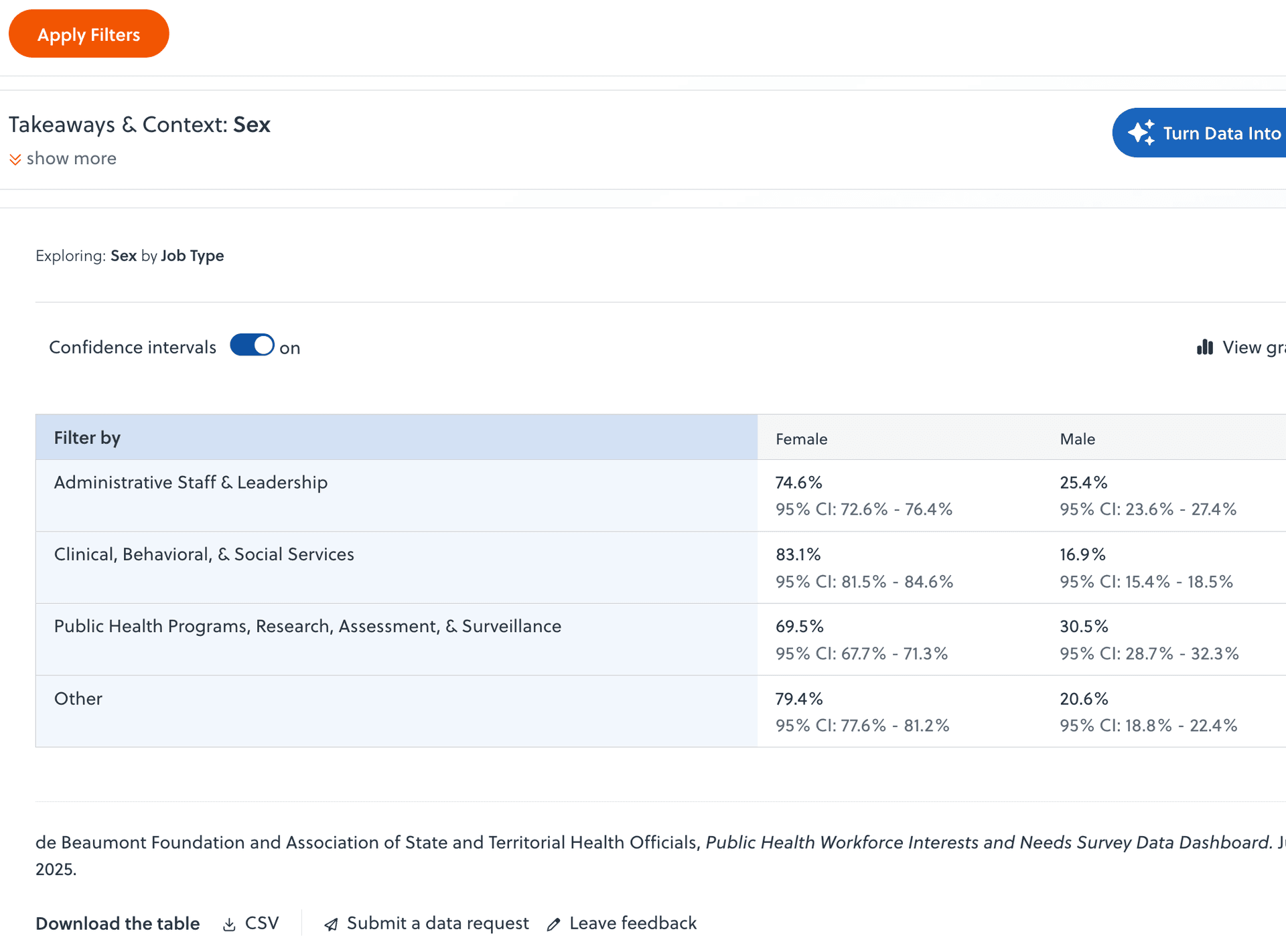 The Demographics topic examines the personal attributes of the workforce such as sex, race and ethnicity, age, educational attainment, public health training, and student loan burden.