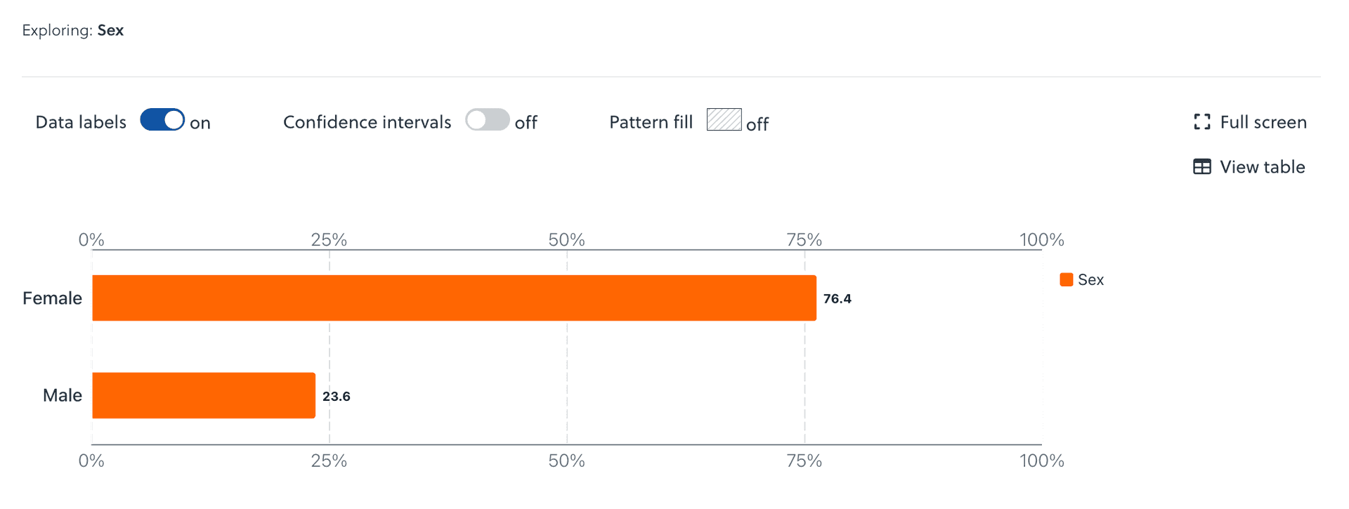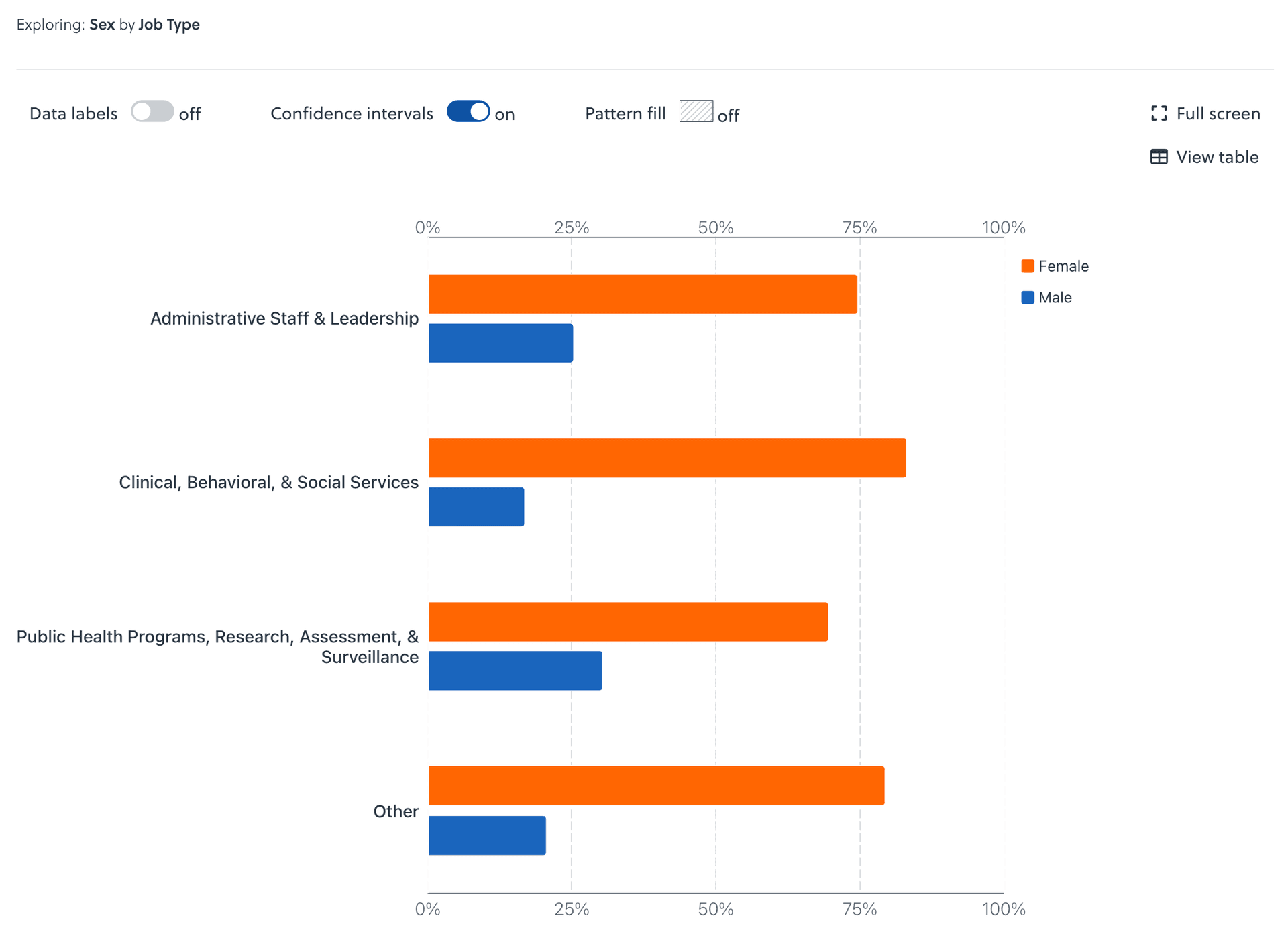 In some cases, you may see confidence intervals with large widths (>15%), meaning that we can be less confident about the result. These appear when the overall population size is small. While the estimates are still accurate, they should be interpreted and used with some caution.