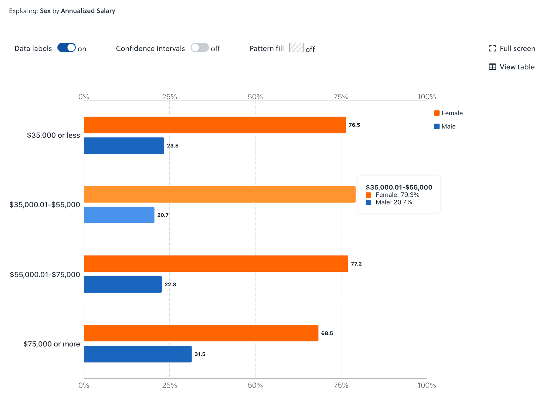 As described in the user guide, data labels are provided for each row in a graph. Those data labels represent the percentage or point estimate for each row in the graph and represent the percentage of the workforce that selected a specific response for a survey question.